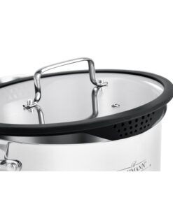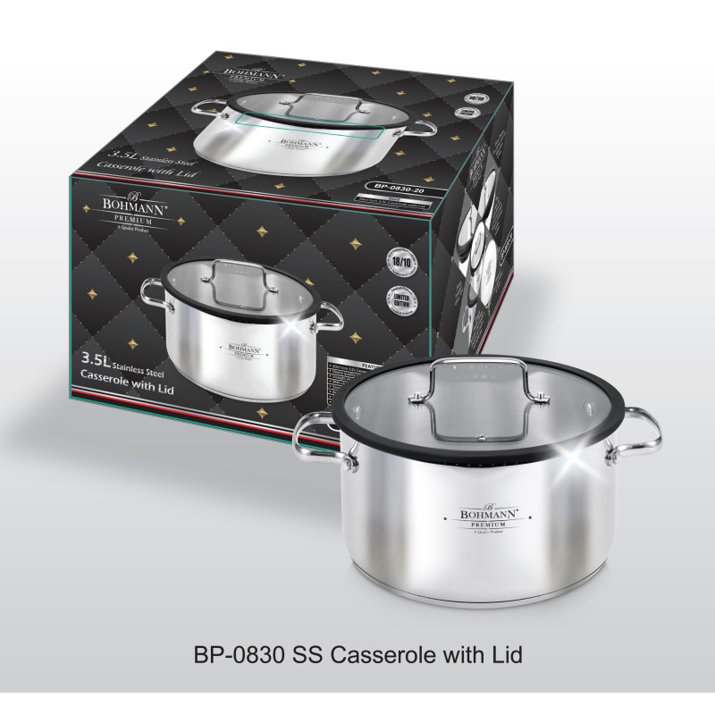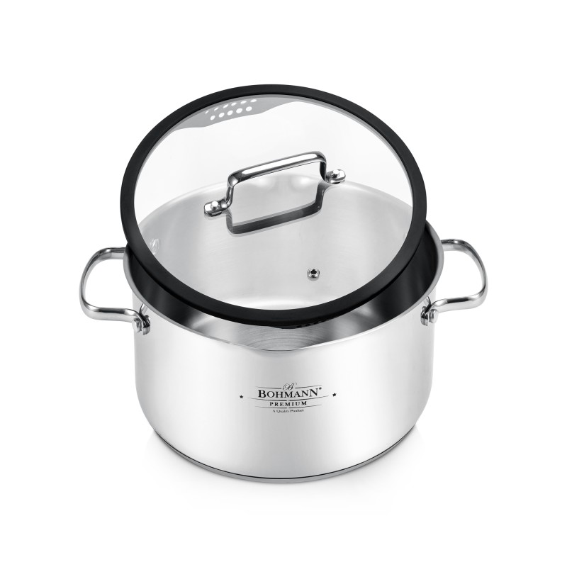 | Cratita din inox 18/10, 20x11cm, 3.5L, cu capac din sticla termorezistenta si orificiu pentru eliberarea aburului, interior gradat, orificii laterale pentru strecurarea lichidului si baza groasa din aluminiu pentru protectie. |