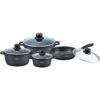 Set 4 vase cu capace Bohmann, fabricate din aluminiu si acoperite cu un invelis din granit.Aluminiul este rezistent la coroziune, confera durabilitate, iar stratul non-stick, pe langa cunoscuta proprietate antiaderenta, nu interactioneaza chimic cu preparatele si pastreaza gustul, culoarea si valoarea nutritionala a ingredientelor.Suprafata de aluminiu de la baza, cu 5 straturi capsulate garanteaza o retentie mare de caldura, generand o economisire de energie, datorita timpului de gatit scurt.Capacele sunt din sticla termorezistenta.