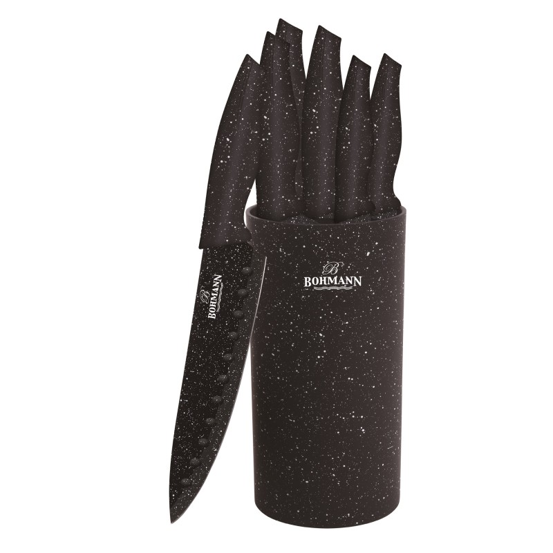 Set de cutite: 6 piese Bohmann, lame negre marmorate, stand rotund, negru