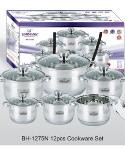 Set oale cu capac Bohmann, este format din 12 piese, material otel inoxidabil de buna calitate, pereti grosi ce asigura o buna conducere a caldurii. Vasele au un design unic cu manere din inox. Pot fi folosite pe toate tipurile de plite (inclusiv plite pe inductie).
