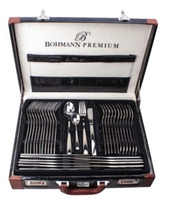 Set tacamuri din inox 18/10, 72 piese, Bohmann Premium in servieta din piele neagra cu insertii maro.
