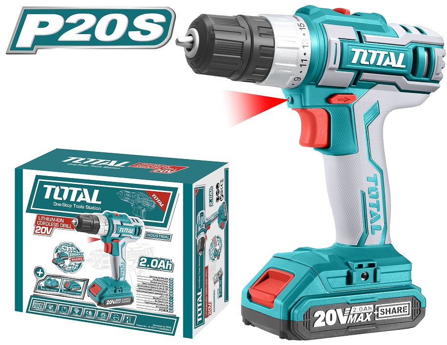 TOTAL – Masina de gaurit cu acumulator 20V-2.0Ah Li-Ion (2 acumulatori + 47 accesorii)